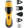 The Barbasol Men’s Battery Operated Beard Trimmer with stainless steel blades features a built-in, adjustable position guide with 4 settings with an easy click for achieving different lengths. The washable heads can be run under water for easy cleaning. This beard trimmer is battery operated and requires 2 AAA batteries (sold separately).