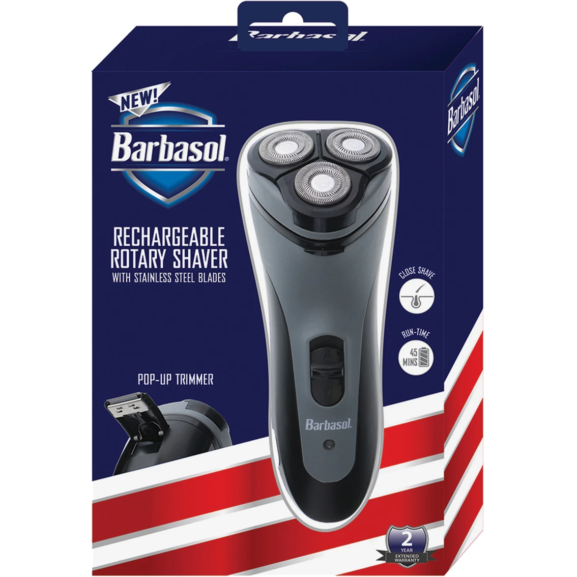 The Barbasol Men’s Rechargeable Dry Rotary Shaver with stainless steel blades and pop up trimmer provides a close, comfortable shave. The stainless steel blades contour to any angle on the face while the pop up trimmer refines and styles sideburns and facial hair. The rechargeable battery fully charges in 8 hours for up to 45 minutes of shaving time.