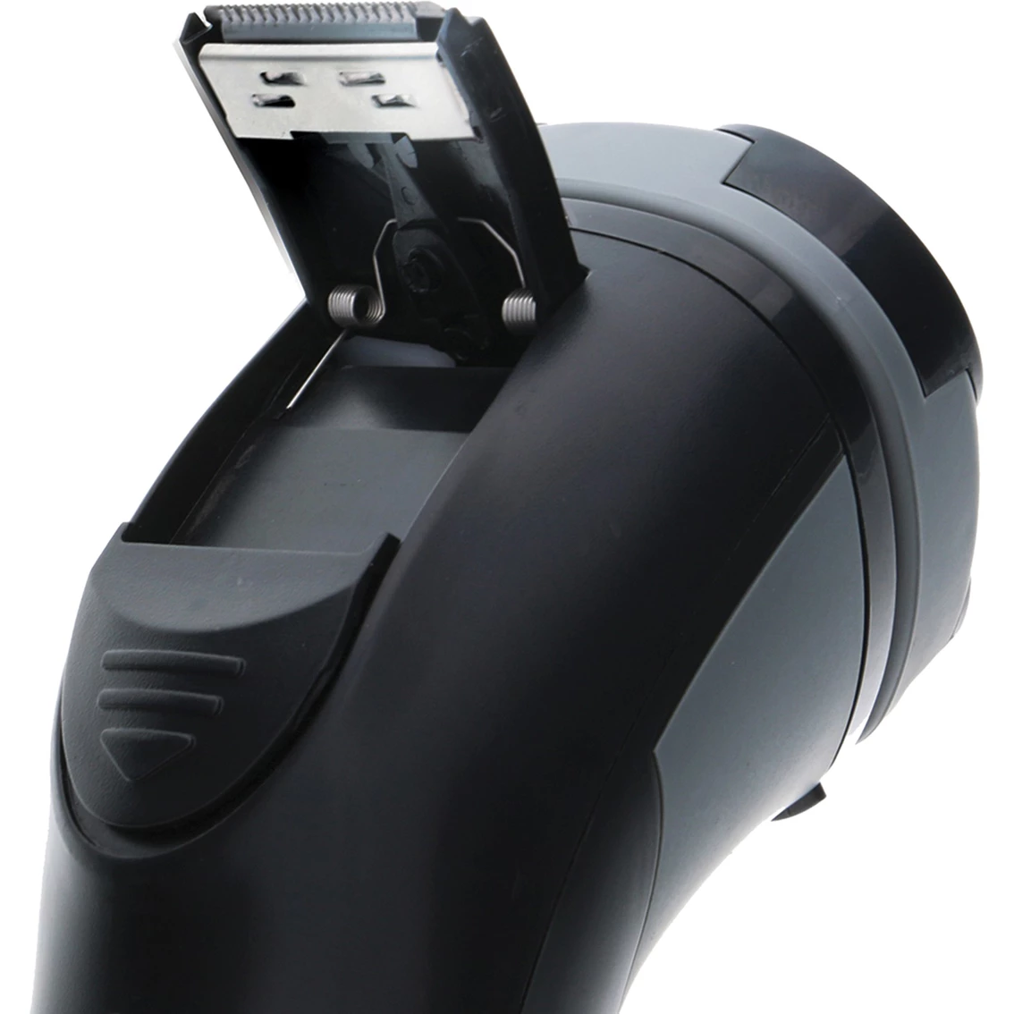 - Pop-up trimmer refines and styles sideburns and facial hair
