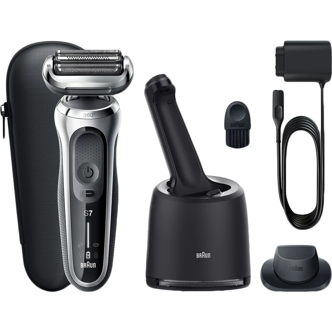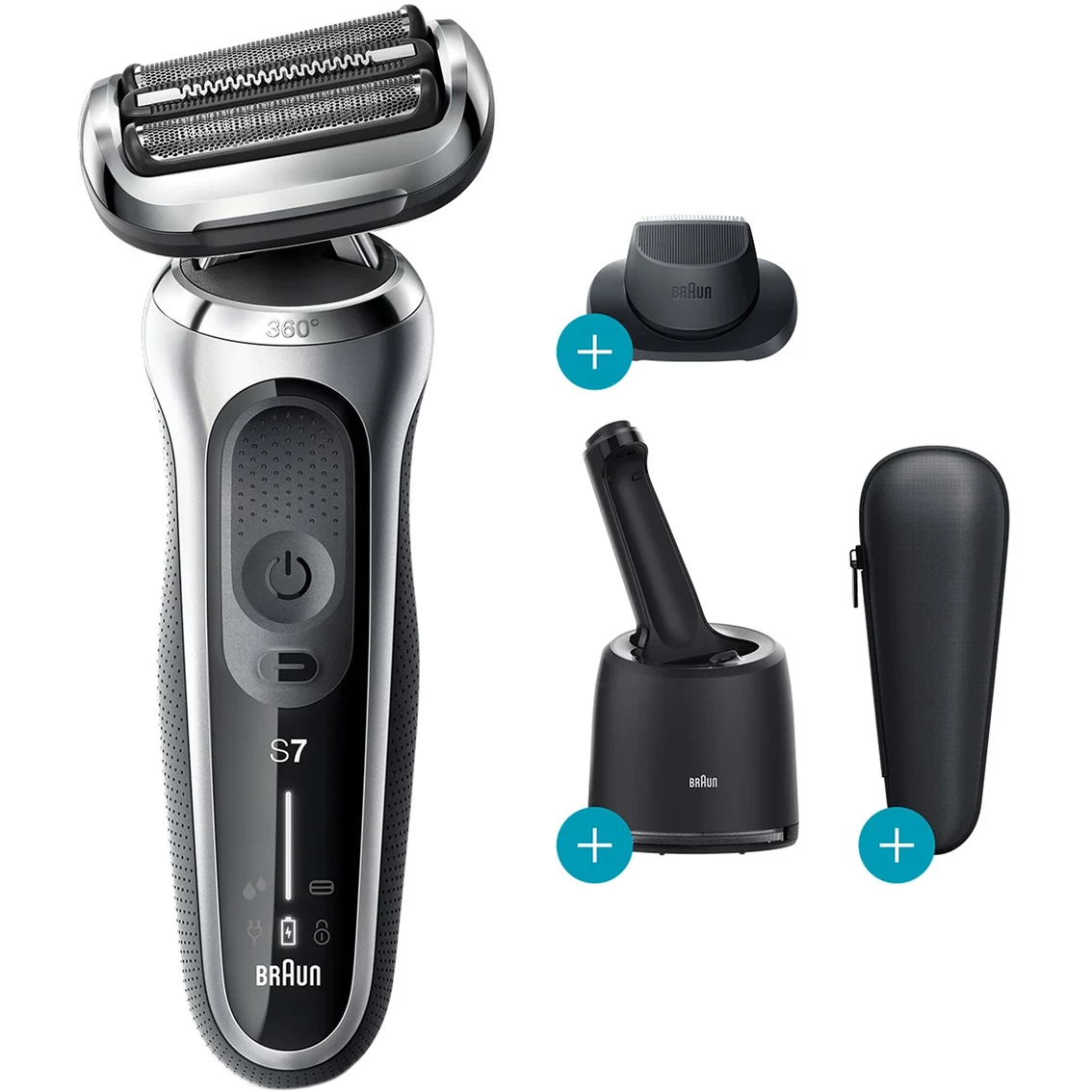 Box includes one Series 7 Electric razor for men, one SmartCare Center, one Precision Trimmer attachment, one travel case, one smart plug for automatic 100-240 voltage adjustment and one cleaning brush. Model: 88572.