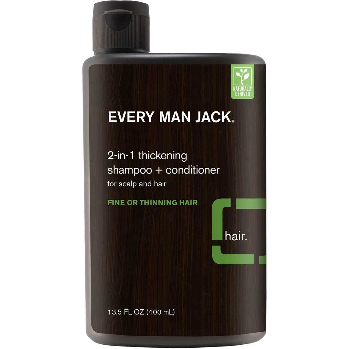 The Every Man Jack 2-in-1 Daily Thickening Tea Tree Shampoo Plus Conditioner has coconut-derived surfactants that clean hair while glycerin and shea butter condition and soften. Soy proteins fortify hair from root to end, leaving hair stronger, thicker and fuller. The formula is ideal for daily use and recommended for fine or thinning hair.