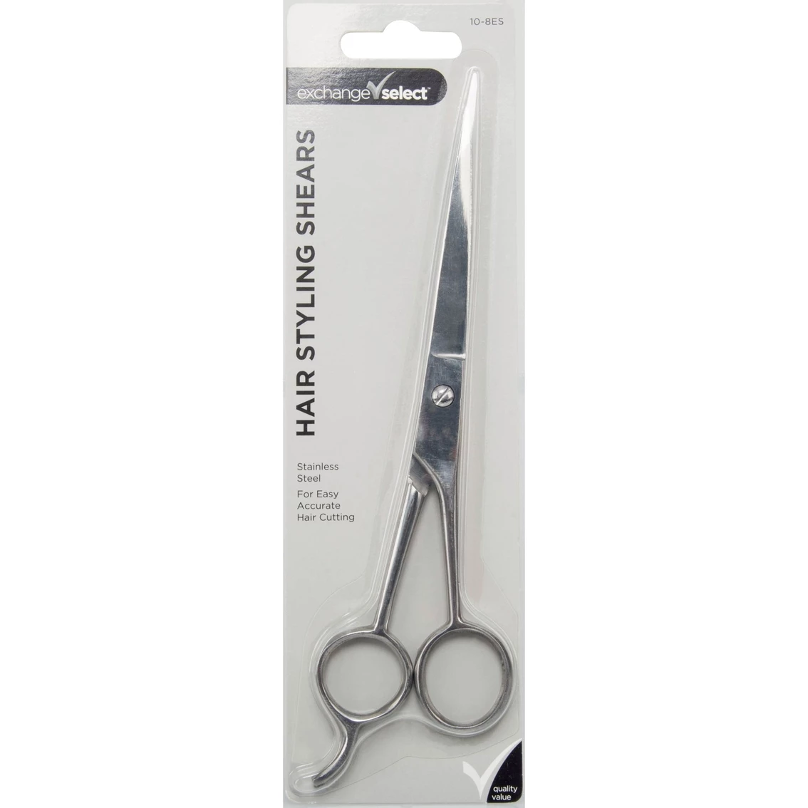 These Exchange Select hairstyling shears are designed to fit comfortably in your hand. The scissors have precision-ground blades and a convenient finger rest for accurate hair cutting. Keep out of reach of children. Model: 108ES.