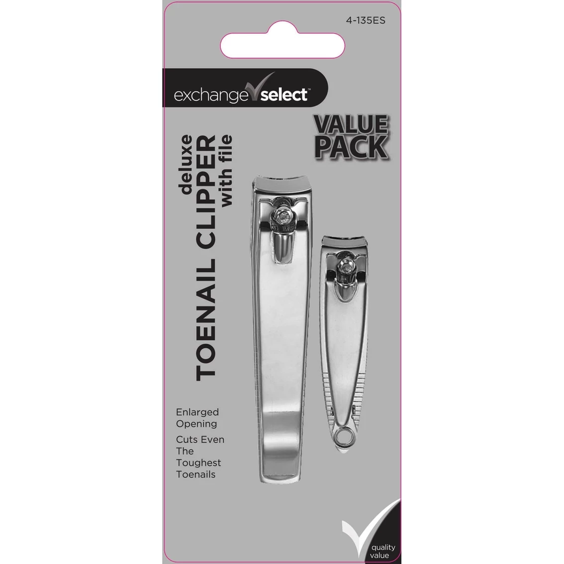 Exchange Select Deluxe Toenail Clipper with File cuts even the toughest toenails. It has an enlarged opening and precision-ground cutting edges to provide clean, even cuts. Keep out of reach of children. Model: 4135ES.