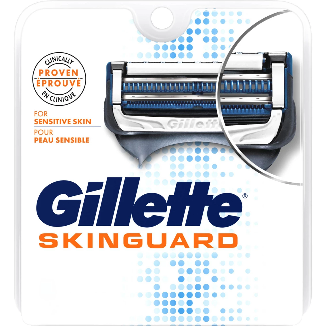 Gillette’s first clinically proven razor designed for sensitive skin, with SkinGuard technology between the blades. Gillette SkinGuard men’s blade refills have a unique SkinGuard between the blades to shave hair and guard skin. The SkinGuard reduces blade contact with the skin. Each blade refill also features two optimally-spaced, low cutting force blades to minimize tug and pull and lubrication before and after the blades to minimize friction and shield skin from irritation.