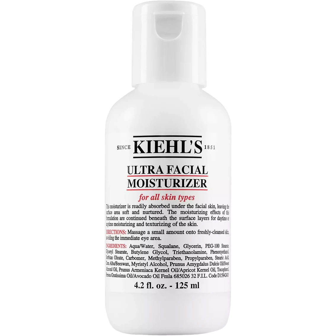 Step up to 24-hour moisture with Kiehl’s Ultra Facial Moisturizer. It is readily absorbed, leaving the surface area soft and nurtured. The moisturizing effects of this formulation continue beneath the surface layers for moisturizing and texturizing of the skin. Kiehl’s Ultra Facial Moisturizer is formulated for all skin types. Massage a small amount onto freshly-cleansed skin. Avoid the immediate eye area.