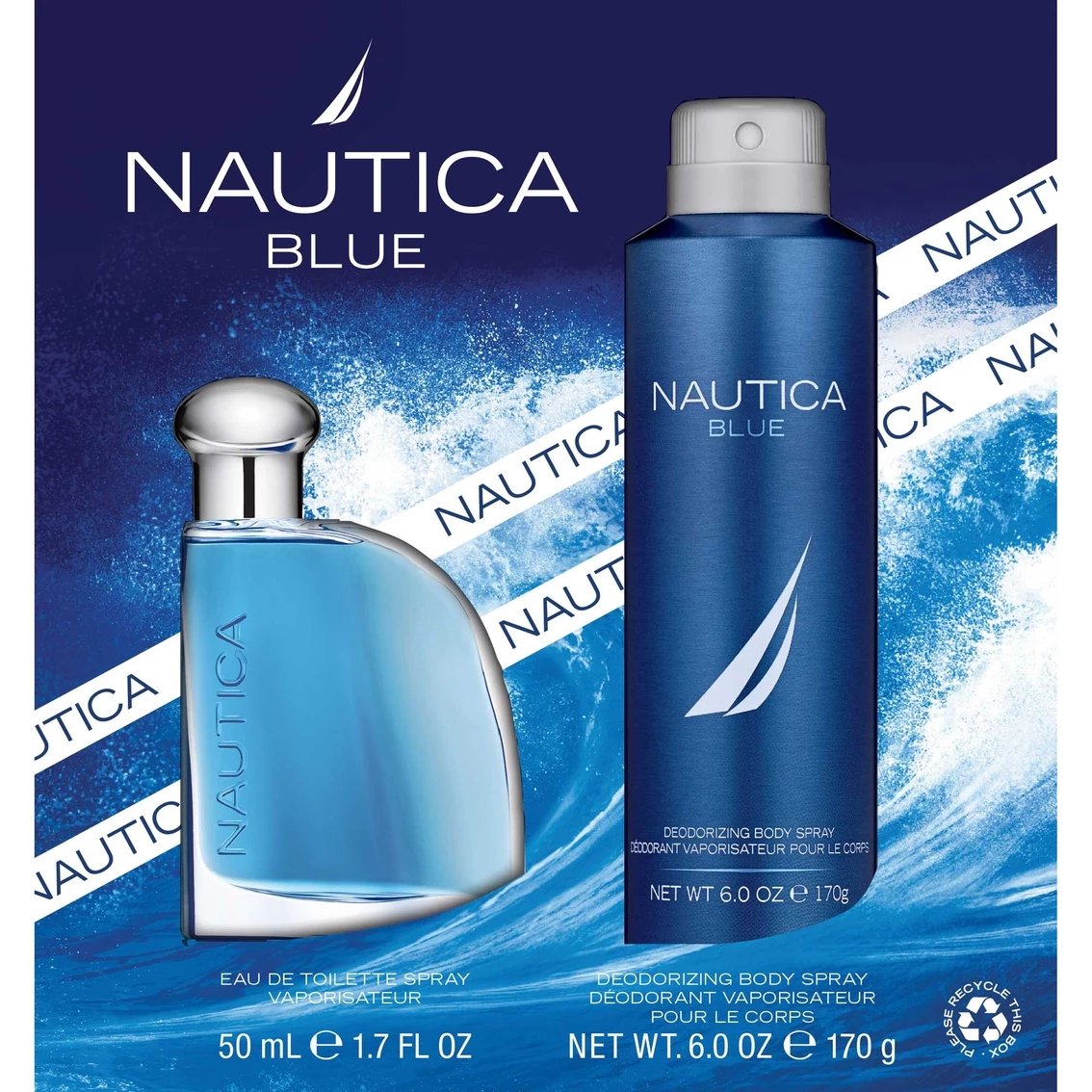 Crisp, energetic, and timeless- perfect for day and night. Nautica Blue has a profile of tropical fruits, and bright citrus with deep, woody undertones. This 2-piece set includes a Nautica Blue 1.7 oz. Eau de Toilette and a Nautica Blue 6.0 oz. Deodorant Body Spray. Model: 99350100178.