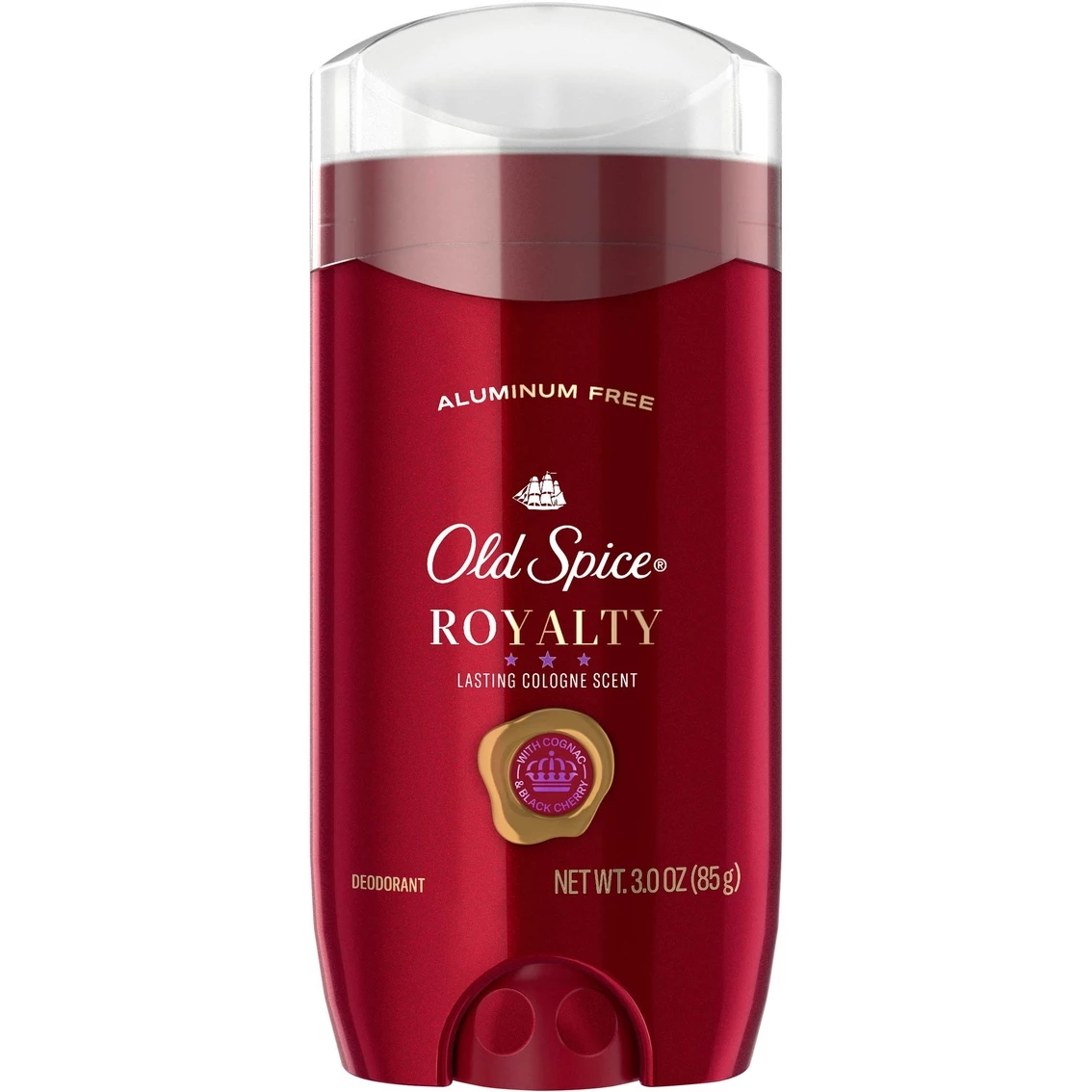 Old Spice Royalty aluminum-free deodorant has the 48-hour odor protection you need and the lasting cologne scent you deserve. Royalty is formulated with notes of cognac and black cherry for a cologne scent with a boozy fragrance. This Old Spice is free of aluminum and parabens and ‘free of’ is a good thing. Old Spice Royalty Deodorant goes on clear to prevent white marksβ on clothes. This is one of Old Spiceβs freshest most premium cologne-scented deodorants in their 80+ year history.