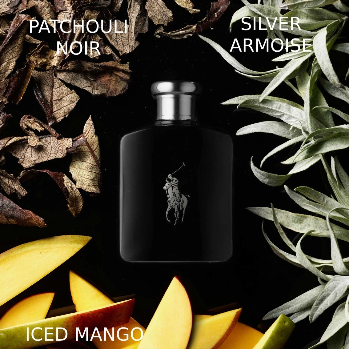 Ralph Lauren Polo Black begins with notes of iced mango, Spanish sage, green effervescent accord, silver armoise, lush liquid accord, hedione, patchouli noir, sandalwood, timberol and tonka bean. This is elegance in a bottle. Size: 4.2 oz.