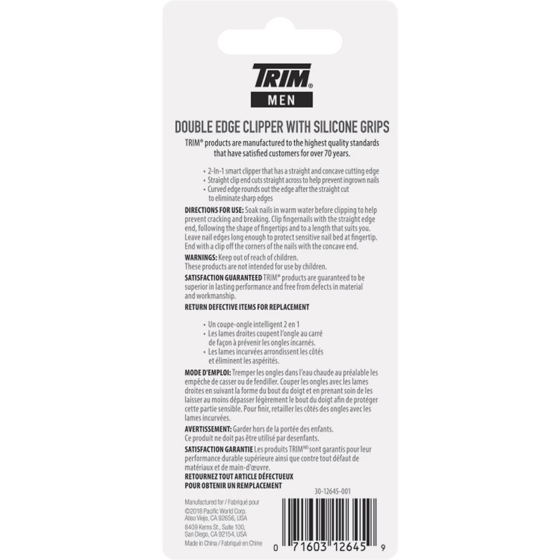 The Trim Men’s No File Dual Edge Clipper with silicone grips is perfect for personal care. This 2-in-1 smart clipper has non-slip grips with straight and concave cutting edges. Model: 01-12645.